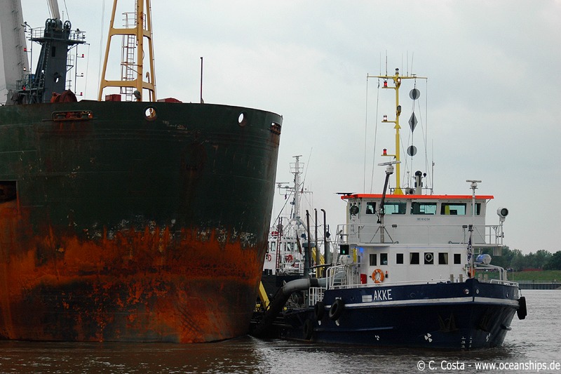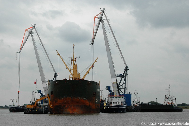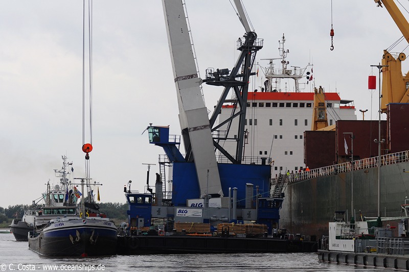 As you can see the whole process is assisted and controlled by tug boats since the river Weser was not closed at this time. Also the anti pollution vessel Luneplate (located on the portside of the vessel) is pumping ballast water as well as bunker out of the vessel in order to lighten it.
