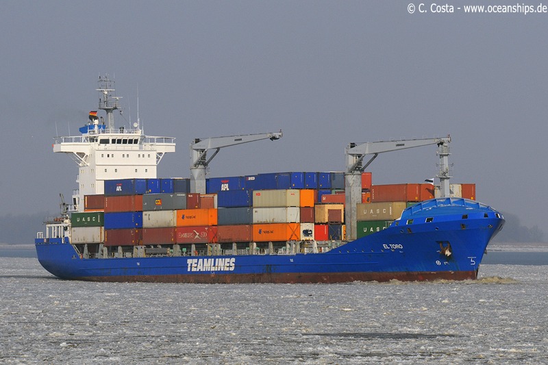 Feeder vessel El Toro is passing Stadersand through the icy waters of the river Elbe on February 17th, 2010.