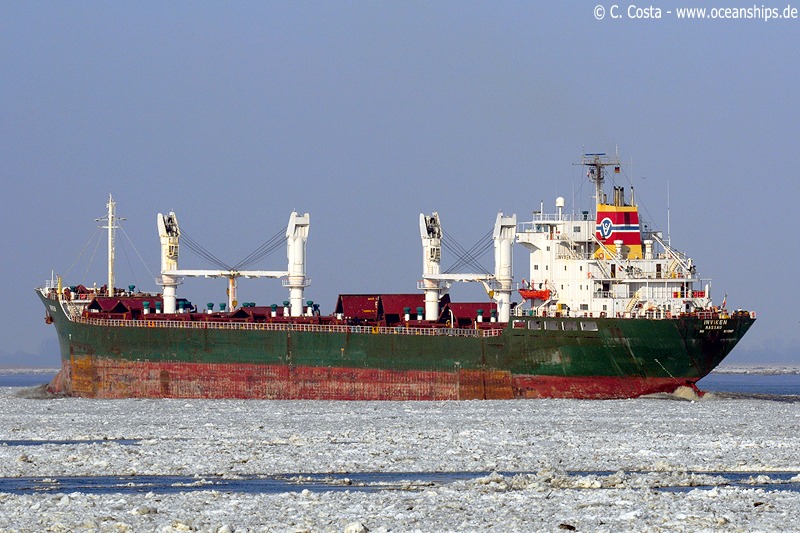 Bulk carrier Inviken is passing Stadersand through the icy waters of the river Elbe on February 17th, 2010.