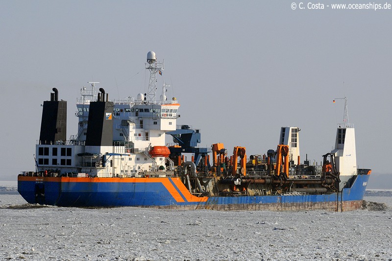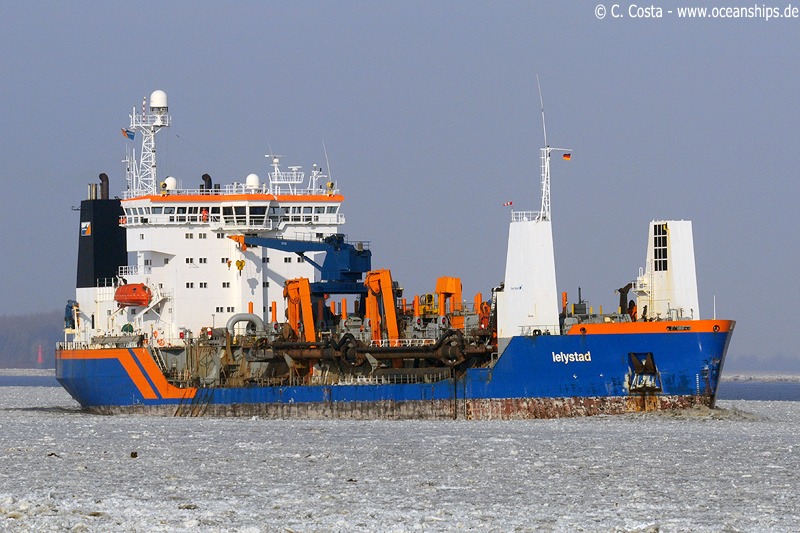 Hopper dredger Lelystad is passing Stadersand through the icy waters of the river Elbe on February 17th, 2010.