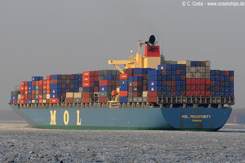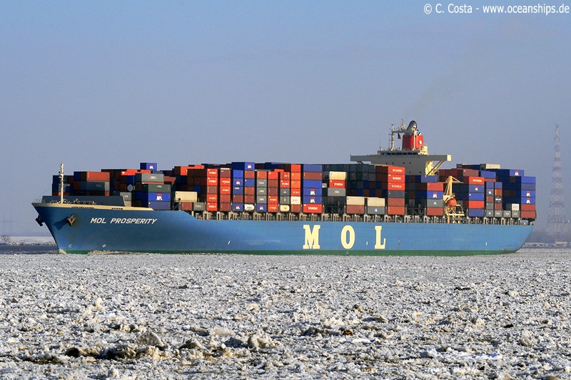 MOL Prosperity is passing Stadersand through the icy waters of the river Elbe on February 17th, 2010.