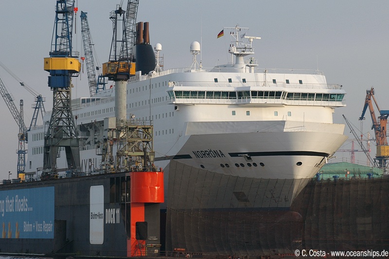 Norröna is docked at Blohm & Voss, Hamburg for maintenance and repair of her stabilizers on January 11th, 2009.