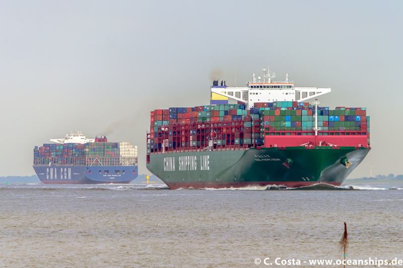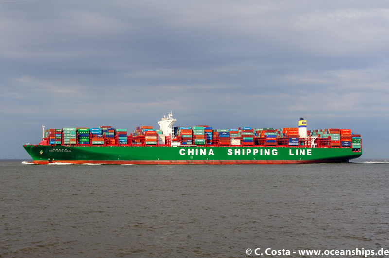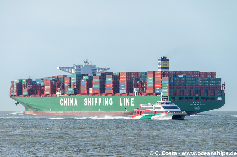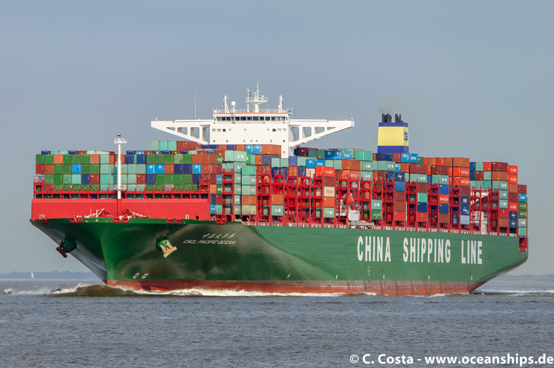 CSCL Pacific Ocean is passing Cuxhaven in the evening of July 22nd, 2015.