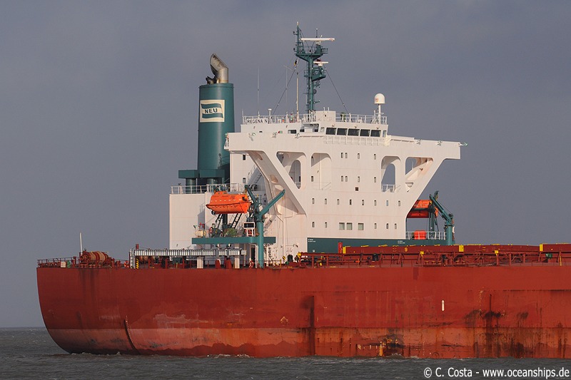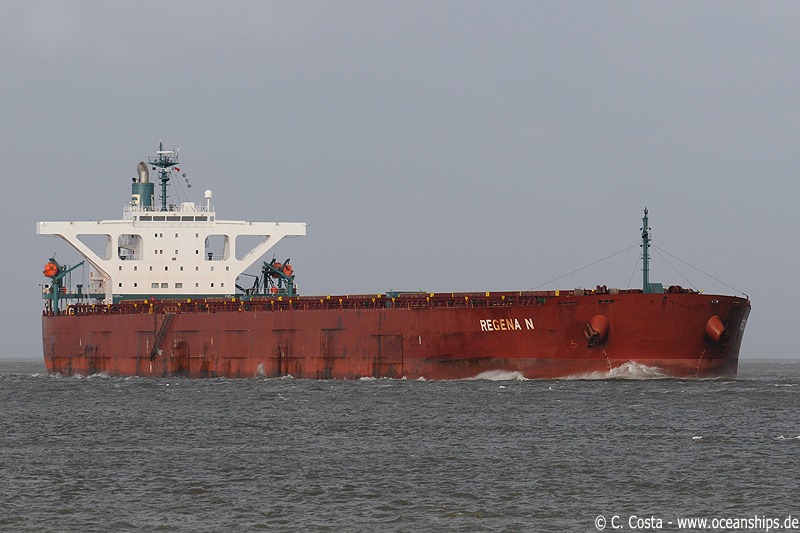 Capesize bulk carrier Regena N is passing Cuxhaven on February 3rd, 2010 with an impressive draft of 15 metres.